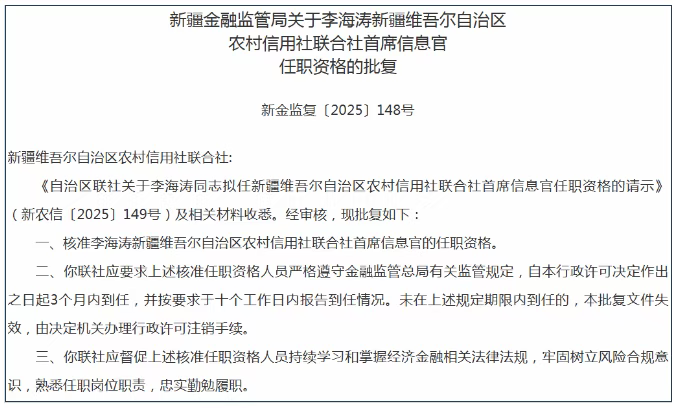 8月29日,国家金融监督管理总局新疆监管局发布的批复显示,核准李海涛新疆联社首席信息官的任职资格。