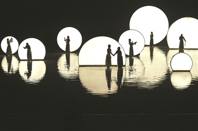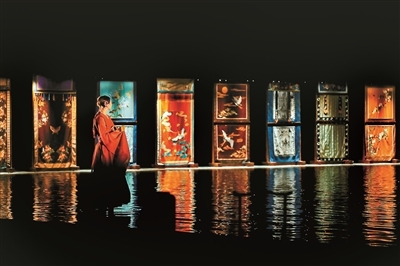 上演剧目《只有红楼梦》的剧场里,能容纳1400人的观众席呈环绕式俯视舞台,演出过程中多个独立舞台升降、旋转,不断打破观众在观演过程中的视觉期待。在《读者》剧场中,由多块屏幕拼接而成的环形舞台,借助屏风的开合,引导观众跟随演员的表演与场景变化在移动中观演。《有还无》则通过水舞台搭配可独立移动的竹筏与门帐,营造太虚幻境虚实交织的意境。