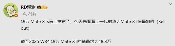 CNMO注意到,华为首款三折叠屏手机Mate XT 非凡大师的销量数据近日引发广泛关注。市场研究机构IDC报告显示,该机型的全球销量已接近50万台,这一数据印证了华为在高端折叠屏技术上的领先地位。另据数码博主博主最新爆料,截止到今年第34周,该机的销量约为48.8万台。对此,不少人调侃“土豪真多”。