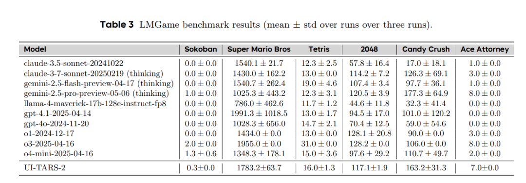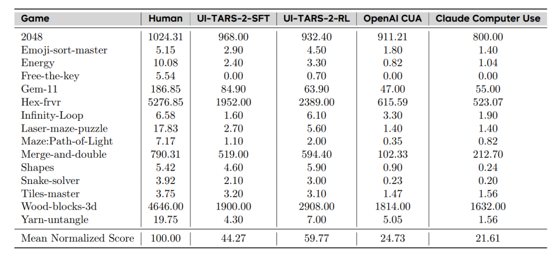 而且在15款小游戏(比如2048、拼图、迷宫)里,它的平均得分差不多是人类水平的60%,比OpenAI、Claude的游戏AI强不少,有的游戏(如“Shapes”)甚至比人玩得还好。