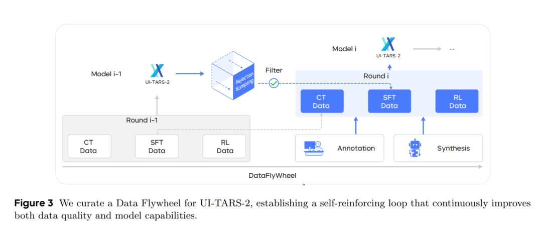 2)多轮迭代:有了数据之后,先让模型通过预训练学习更广泛的知识(如不同GUI操作流程、任务解决思路等),再使用高质量特定任务数据对模型进行优化,最后通过强化学习进行端到端优化。