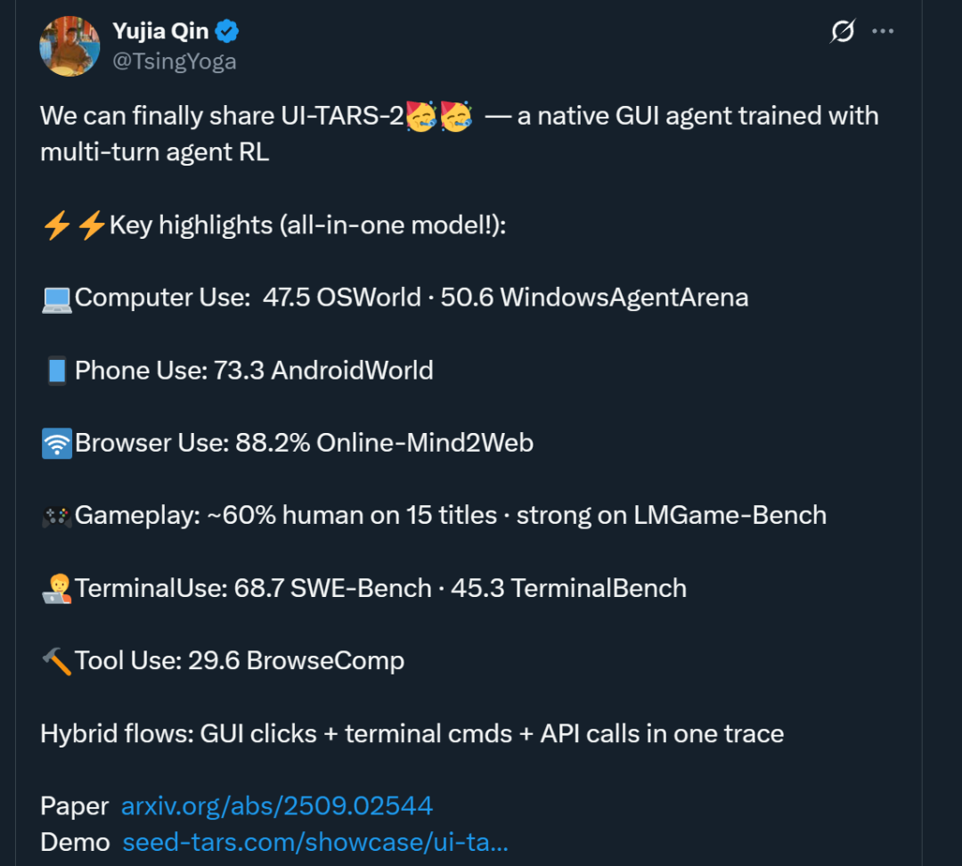 这就是Seed最新发布的智能体UI-TARS-2,它不止采用了All in one这样的原生设计,而且表现更是优于Claude和OpenAI Agent等竞争对手。