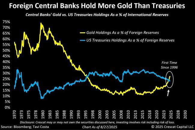 今年,黄金与政府债券的命运轨迹出现了明显分化。本周金价创下新高,而许多长期债券收益率则达到数年甚至历史最高水平。尽管美国国债仍然享有来自央行和其他管理外汇储备的官方机构稳固的基本面需求,但其在全球储备投资组合中的地位基本上停滞不前。与此同时,央行的黄金持有量因需求加速和价格飙升而激增。