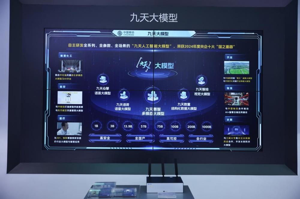 作为本次大会的亮点展项之一,中国移动自主研发的“九天”通用基础大模型备受瞩目。“九天”具备多模态、大参数、全场景能力,支持云、边、端侧全场景应用环境,实现了“高安全、高可控、全国产、全行业”四大核心优势,成功入选2024年央企十大国之重器。针对广大小微企业AI转型需求,中国移动还推出了算力一体机,基于“网络+存储+AI”一体化解决方案,破解传统设备分散、运维复杂、AI能力缺失三大痛点,实现“一台设备管全网、一套系统保安全”。
