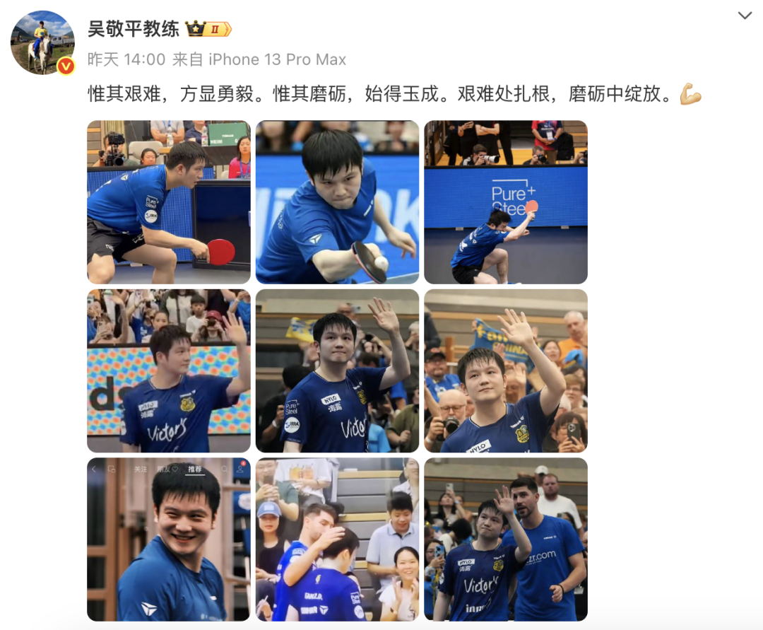 4日,樊振东的前教练吴敬平更新了社交媒体,晒出多张樊振东的照片,为德甲首秀失利的他鼓劲打气:“惟其艰难,方显勇毅。惟其磨砺,始得玉成。艰难处扎根,磨砺中绽放。”