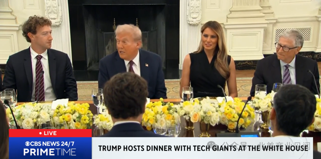 扎克伯格坐在特朗普旁边,盖茨则坐在第一夫人梅拉尼娅·特朗普旁边。