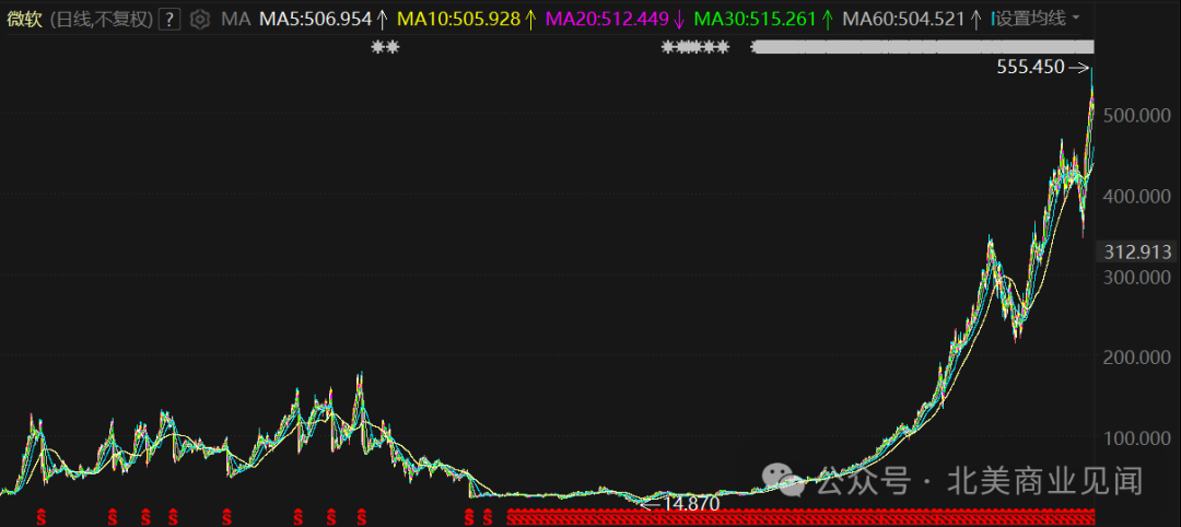 1986年,微软IPO后首个交易日开盘价为21美元,当天收盘价为27.75美元。之后进行了多次拆股,最新股价为507.97美元。因此,综合计算下来,首个交易日当天买入的微软股票如果持有到今天,每股的成本仅为7美分。