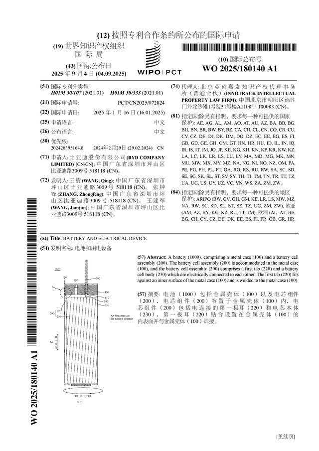 证券之星消息,根据企查查数据显示比亚迪(002594)公布了一项国际专利申请,专利名为“电池和用电设备”,专利申请号为PCT/CN2025/072824,国际公布日为2025年9月4日。