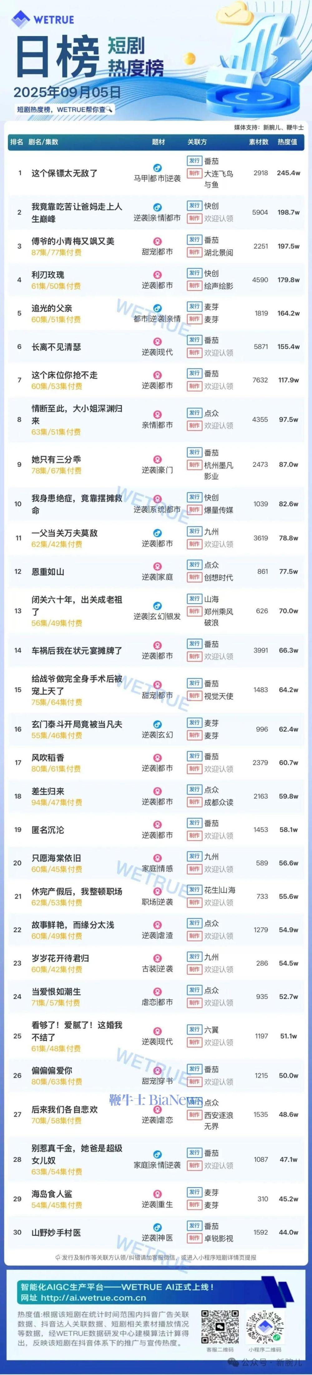 1、本日榜为WETRUE短剧数据公司提供,新腕儿和鞭牛士提供联合支持。