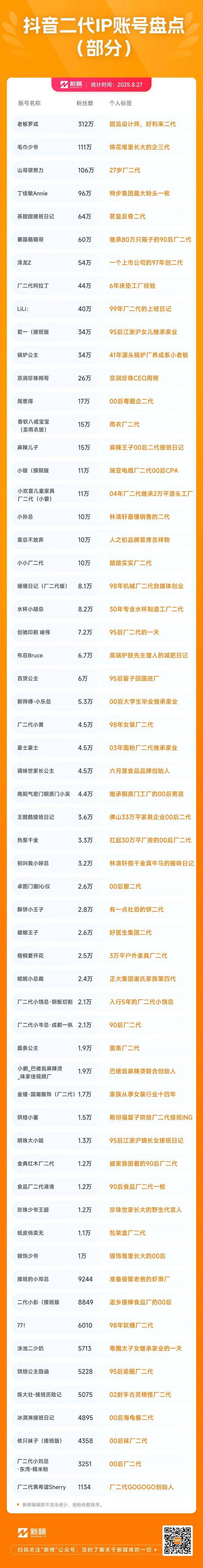 不错的曝光,可观的转化,让不少二代相信,一个成功的社交账号会是他们接班路上的重要助手。以抖音为例,据新榜旗下抖音数据工具新抖统计,搜索关键词“二代”,有超过5000个相关账号,搜索关键词“厂二代”,至少有1413个相关账号。