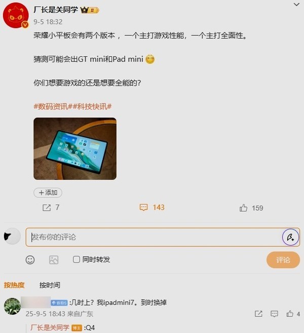 CNMO了解到,荣耀将在2025年底密集发布多款新品,除Magic 8系列手机外,还包括新款小平板。而早在2025年7月,多位行业人士透露荣耀正在评估一款7.9英寸小平板,定位高性能便携市场。随后荣耀平板与IoT业务负责人通过社交平台确认将推出小平板新品,并公开调研处理器方案(高通旗舰芯或联发科旗舰芯),暗示产品将平衡性能与能效。