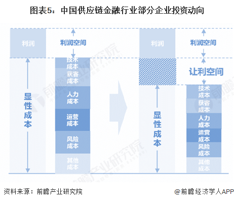 从中国供应链金融产业代表性企业的对外投资来看,供应链金融产业成本利润空间随着人力成本、运营成本、风险资本、获客成本、技术成本有所不同,其中显性成本越低,让利空间越高,整体利润空间越高,因此要做好成本管控。
