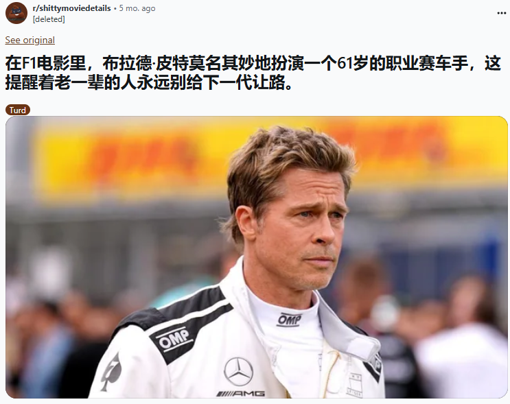 对于《F1》这部赛车电影到底讲了啥,海外论坛reddit上就有网友锐评: