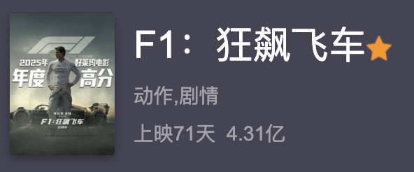 但在欧美电影国内普遍遇冷和影片题材小众的双重“劣势”加持下,《F1》却逆风拿到4.3亿的票房。