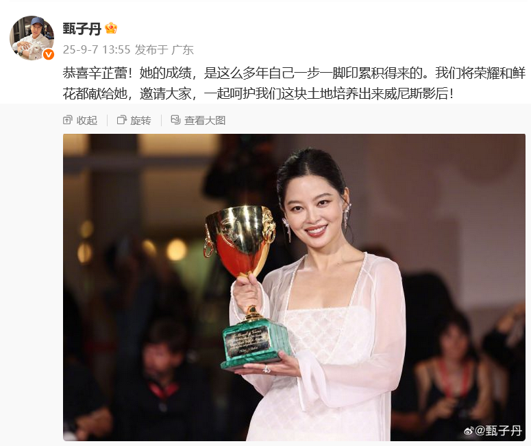 众明星也开始祝贺,甄子丹晒出辛芷蕾捧奖杯照片祝贺:“恭喜辛芷蕾!她的成绩,是这么多年自己一步一脚印累积得来的。我们将荣耀和鲜花都献给她,邀请大家,一起呵护我们这块土地培养出来威尼斯影后!”