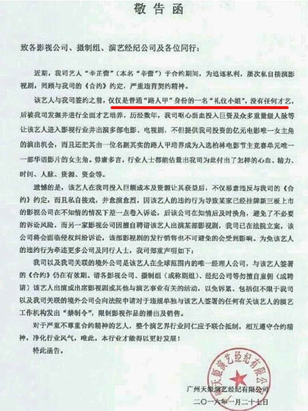 通过《长江图》这部影片,辛芷蕾流量大涨,之后,她也想有更大的发展道路,所以想要离开广州天姬经纪公司,而经纪公司直接一份敬告函罗列了辛芷蕾的“黑历史”,说她只是路人甲,没有任何才艺。