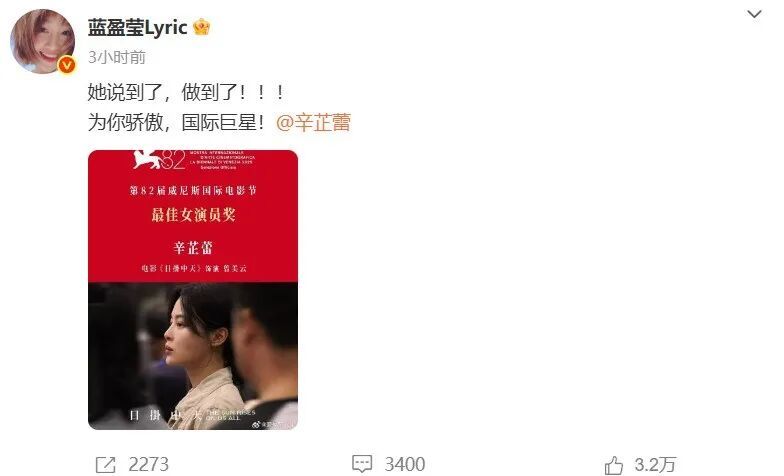 蓝盈莹发文称:“她说到了,做到了!!!为你骄傲,国际巨星!”