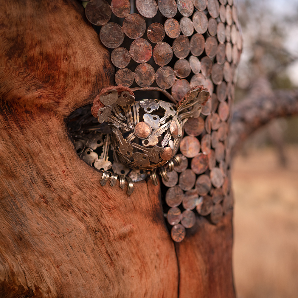 这件名为《摇钱树》的雕塑作品,通体由硬币组成,除了树木主体之外,这件雕塑作品还藏着许多有趣的细节,比如高处的树枝上站着一只鹦鹉,树干的树洞里住着一只小老鼠。