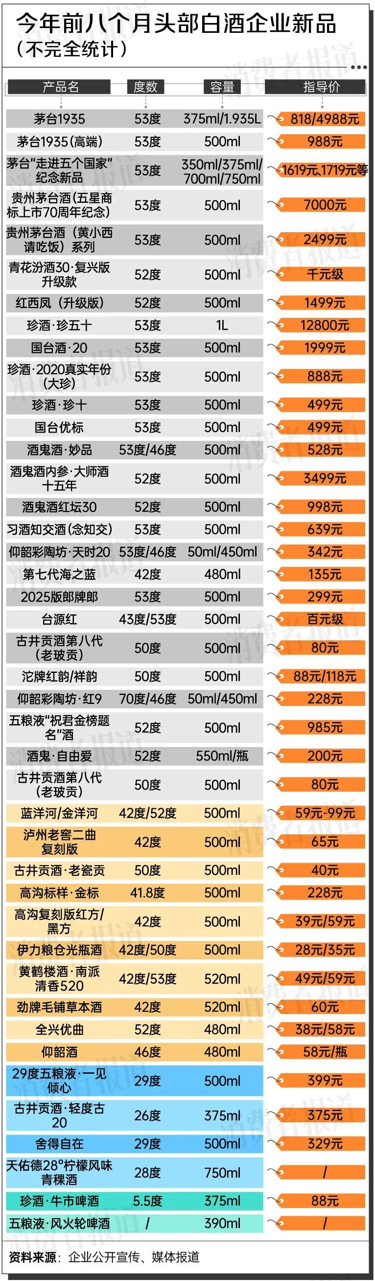 据《消费者报道》记者不完全统计,今年以来,头部酒企共发布了40余款新品,光瓶酒、低度酒和跨界推出的啤酒占了将近一半。其中,光瓶酒占了四分之一,近期密集上市的低度酒也占了十分之一。