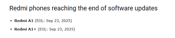 REDMI A1与REDMI A1+于2022年9月发布,搭载基于Android 12的MIUI 12系统。两款设备后续升级至MIUI 13,但未获得任何Android大版本更新,至今仍运行Android 12。从本月起,这两款机型将不再接收安全补丁,存在潜在安全风险。