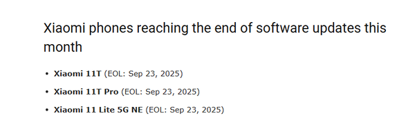 此次进入生命周期末期(EOL)的机型包括:小米11T、小米11T Pro、小米11 Lite 5G NE、REDMI A1、REDMI A1+ 以及 POCO M5。其中,小米11T系列及11 Lite 5G NE的终止支持日期为2025年9月23日,POCO M5则已于9月6日停止更新。