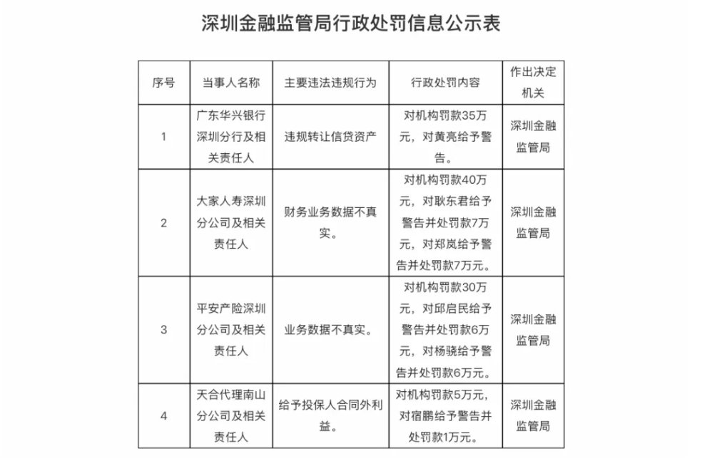 比如大家人寿深圳分公司和平安产险深圳分公司,均因“财务业务数据不真实”被罚,前者罚40万,后者罚30万;而广东华兴银行深圳分行则是因为“违规转让信贷资产”——本质上也是一种数据和行为失真;就连保险代理公司天合代理南山分公司也因为“给予投保人合同外利益”被处罚,这类行为往往伴随着账务上的“灵活处理”。