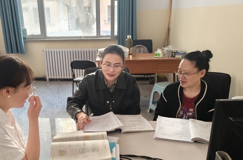 曹凤老师(中)和援疆教师瞿振芳(右)一起帮助莎车当地教师提高教学规范性