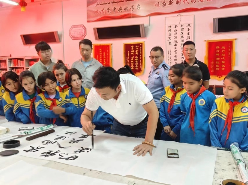 莎车七中的招生季,朱老师还来到现场,挥毫为学生写书签,吸引了不少学生因“字”结缘报考七中。春节写春联,更是点燃了当地师生对传统文化的兴趣。如今,30多名学生、20余名教师在他的带领下,沉醉于笔走龙蛇的墨香世界。书法,这枚来自浦江之畔的文化火种,正在叶尔羌河畔散发迷人的光彩。