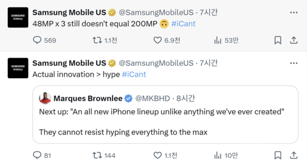 【CNMO科技消息】9月10日,有外媒报道称,三星美国分公司在X平台公开嘲讽苹果新发布的iPhone 17系列。称三个4800万像素摄像头仍无法与2亿像素相提并论,并附上标签“iCant”(疑似指iPhone做不到)。