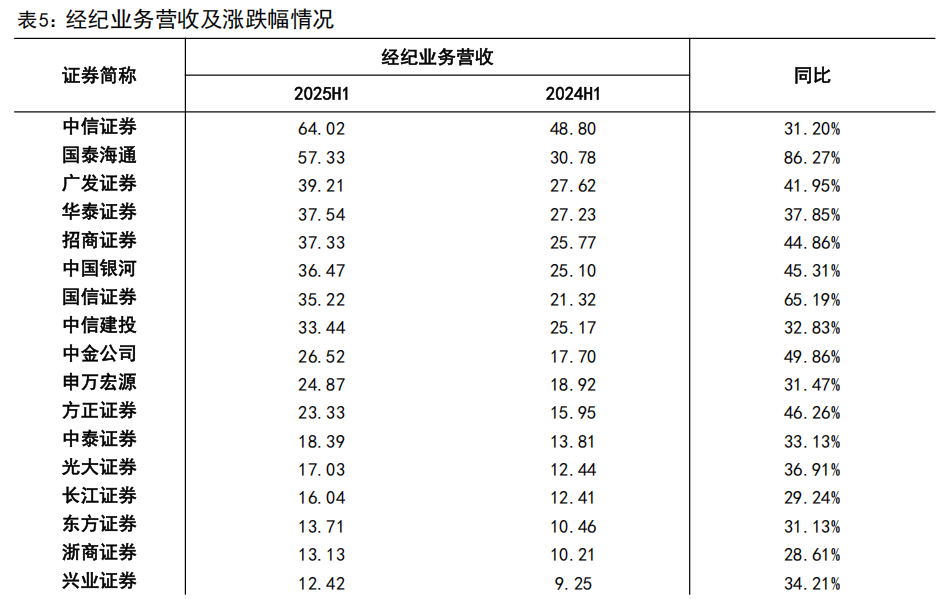 从上市券商来看,受益于市场交投活跃,上市券商经纪业务表现靓丽。从排名来看,2025H1,中信证券以64.02亿元排名市场第一,同比+31.2%;国泰海通、广发证券分别以57.33亿元 、39.21亿元排名第二、第三。从涨跌幅来看,2025H1,42家上市券商均实现不同程度的正增长,其中国联民生以223.77%的涨幅位居第一位。