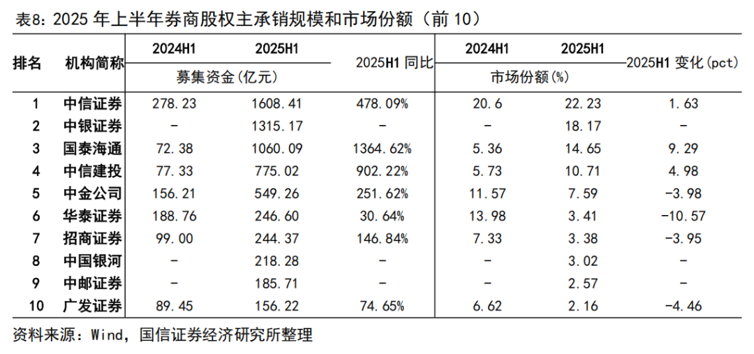 头部券商主承销规模和市场份额均有所提升。据Wind数据显示,2025年上半年,中信证券主承销规模1,608.41亿元,同比+4.78倍,市场份额22.23%,提升 1.63pct;国泰海通承销规模1,060.09亿元,同比+13.65倍,市场份额14.65%,提升9.29pct。