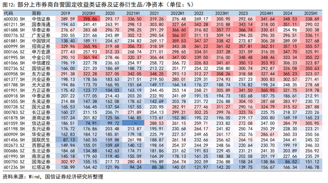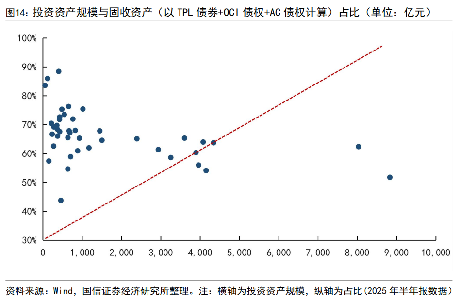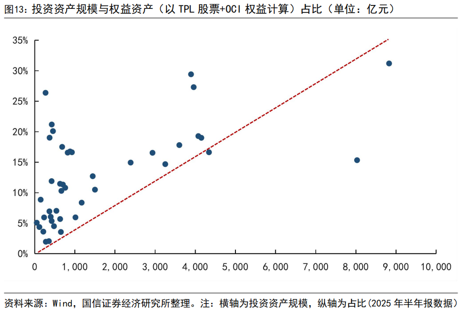 金融投资资产规模越大的券商,权益资产配置占比越高。我们以上市券商2025年半年报的数据为基础,发现金融投资资产规模越大的券商,往往呈现权益资产配置占比越高、固收资产配置占比越低的规律。我们认为主要原因有二,一是大券商资本更充足,对权益资产价值波动的吸收能力更强,增加权益资产配置有望提高预期收益率;二是大券商业务条线更广泛,配置权益资产可能是打通条线桎梏、实现协同发展的重要一环,比如开展场外衍生品业务时即需要权益持仓做对冲。