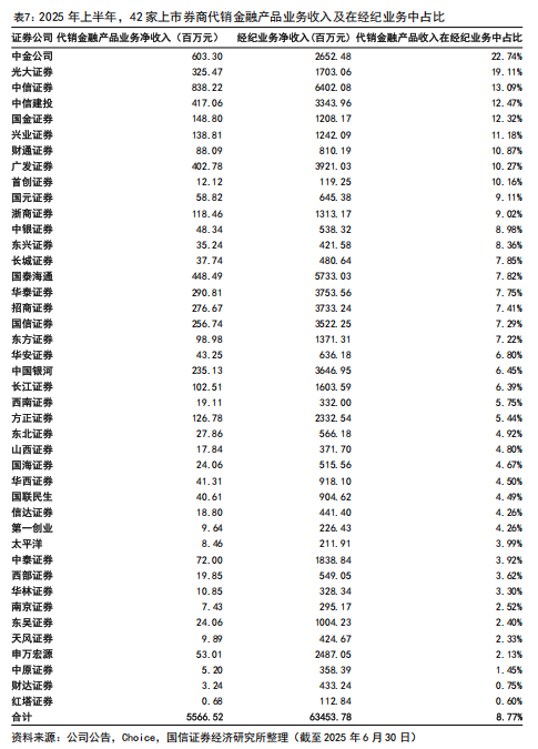 2025年上半年,42家上市券商产品代销占经纪净收入比重8.77%,同比减少0.79pct。代理销售金融产品业务成为行业财富管理转型初级阶段的关键环节和发力领域,我们以代销金融产品收入在经纪业务中占比为衡量指标,在42家上市证券公司中,中金公司、光大证券、中信证券、中信建投和国金证券的代销金融产品收入在经纪业务收入中占比分别为22.74%、19.11%、13.09%、12.47%、12.32%,均高于行业平均水平。