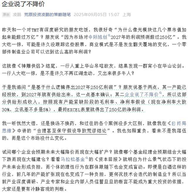 9月5日,私募基金机构荒原投资董事长、实控人凌鹏在公众号发了一篇名为《企业说了不降价》的文章,对“市场对中际旭创2027年的利润预测超过250亿”产生质疑。