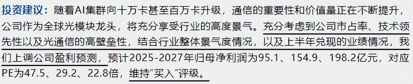 值得注意的是,9月7日,国盛证券通信宋嘉吉团队发表了一篇对中际旭创业绩点评的报告:随着AI集群向十万卡甚至百万卡升级,通信的重要性和价值量正在不断提升,公司作为全球光模块龙头,将充分享受行业的高度景气。维持中际旭创“买入”评级,上调公司盈利预测,预计2025-2027年归母净利润为95.1、154.9、198.2亿元。而4月份其对中际旭创2027年的利润预测为125.1亿元,5个月后上调了73亿元。
