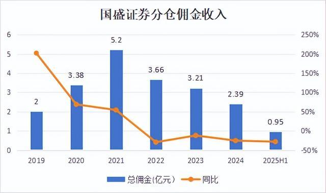 在这种环境下,国盛证券也未能逃脱分仓佣金收入下降的命运。上半年分仓佣金收入0.95亿元,同比下降28.35%,佣金席位占比2.12%,较去年末的2.18%有所下降。在此之前佣金收入已连续三年收缩,2021-2024年分别为5.2亿元、3.66亿元、3.21亿元、2.39亿元,三年缩水54.03%。