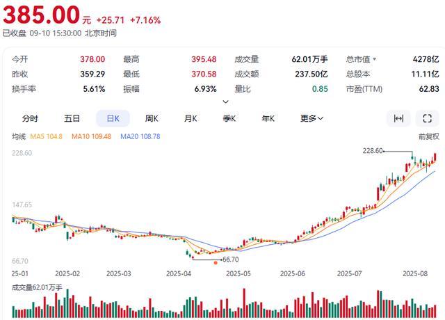 中际旭创的股价自2025年4月中旬以来涨幅显著。9月4日曾一度触及今年最高点448元/股;9月3日总市值4735.48亿元,超过东方财富(300059.SZ),位列创业板第二,仅次于宁德时代(300750.SZ)。在买卖双方互呛之后,中际旭创股价在9月8日、9日连续两天跳水,但10日恢复上涨最终收盘385元/股,年内股价翻了2倍多。