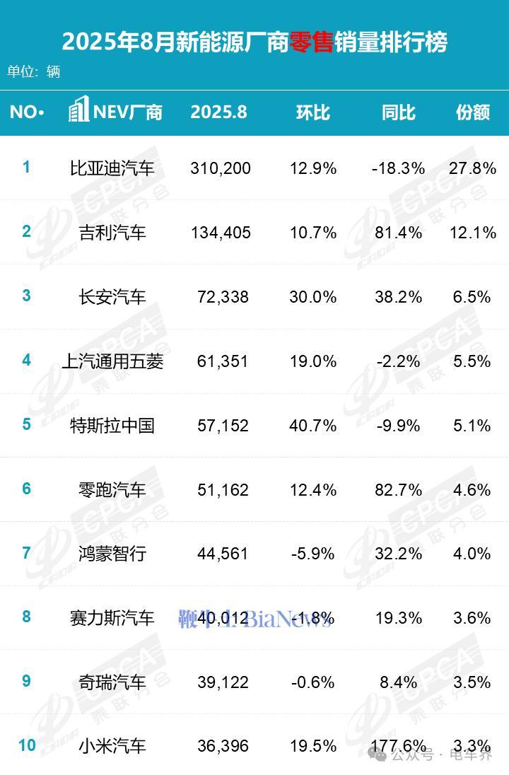 根据乘联分会发布的排名,8月小米汽车在中国新能源市场以3.3%的市场份额位列第10位。