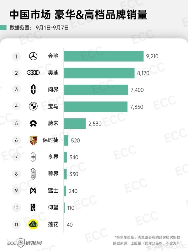 根据汽车博主发布的最新数据,2025年第36周(9月1日至9月7日),中国市场豪华和高档汽车品牌的销量榜单揭晓。据CNMO了解,在当周,奔驰以9210台的销量位居榜首,紧随其后的是奥迪,销量达8170台。问界以7400台的销量成功超越宝马,后者本周销量为7350台,排名第四。