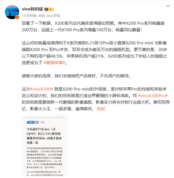 9月11日,vivo产品经理韩伯啸发文回顾了X200系列的销售成绩,他表示销量超出预期,同时还透露了X300系列的产品定位与目标。
