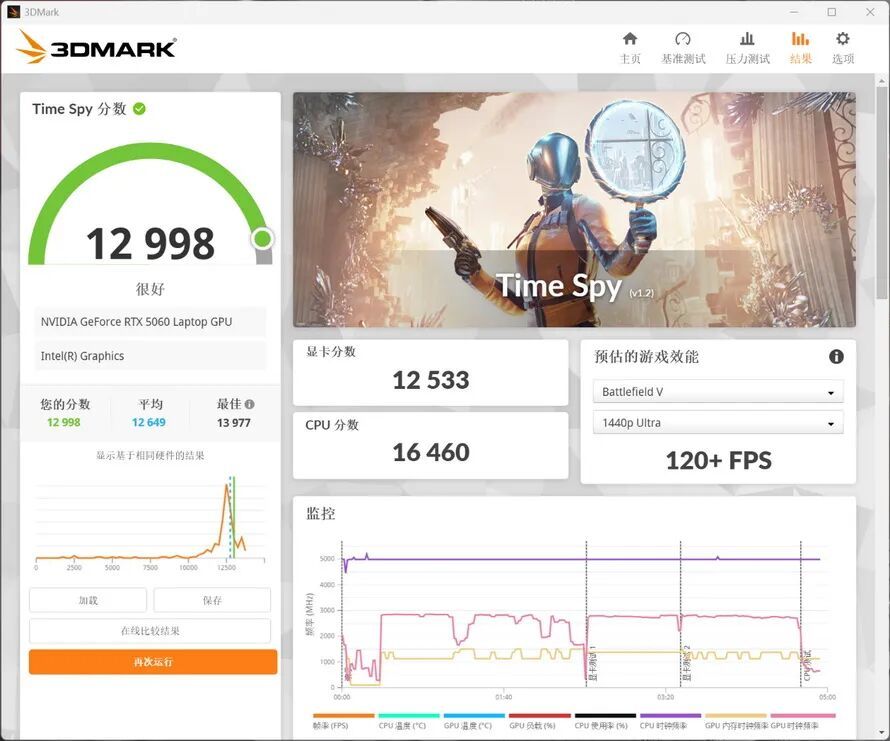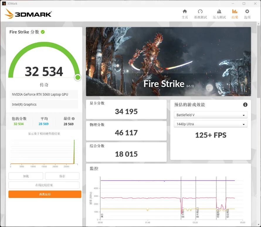 在3DMark TimeSpy中,耀世16 Ultra上搭载的RTX 5060 Laptop得分12533,其中总分为12998,在FireStrike中,显卡得分为34195,总分为32534。