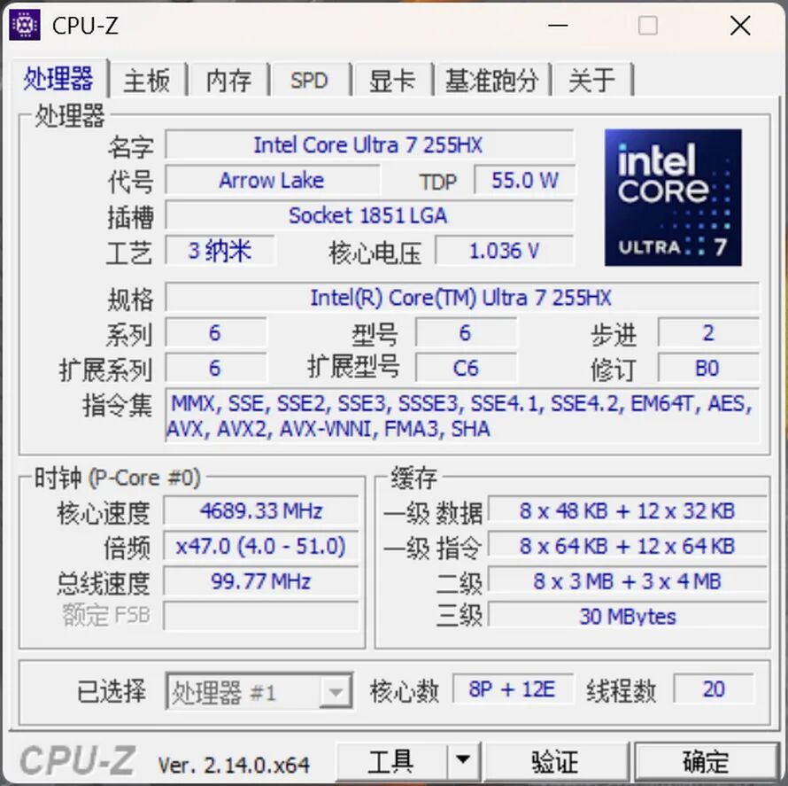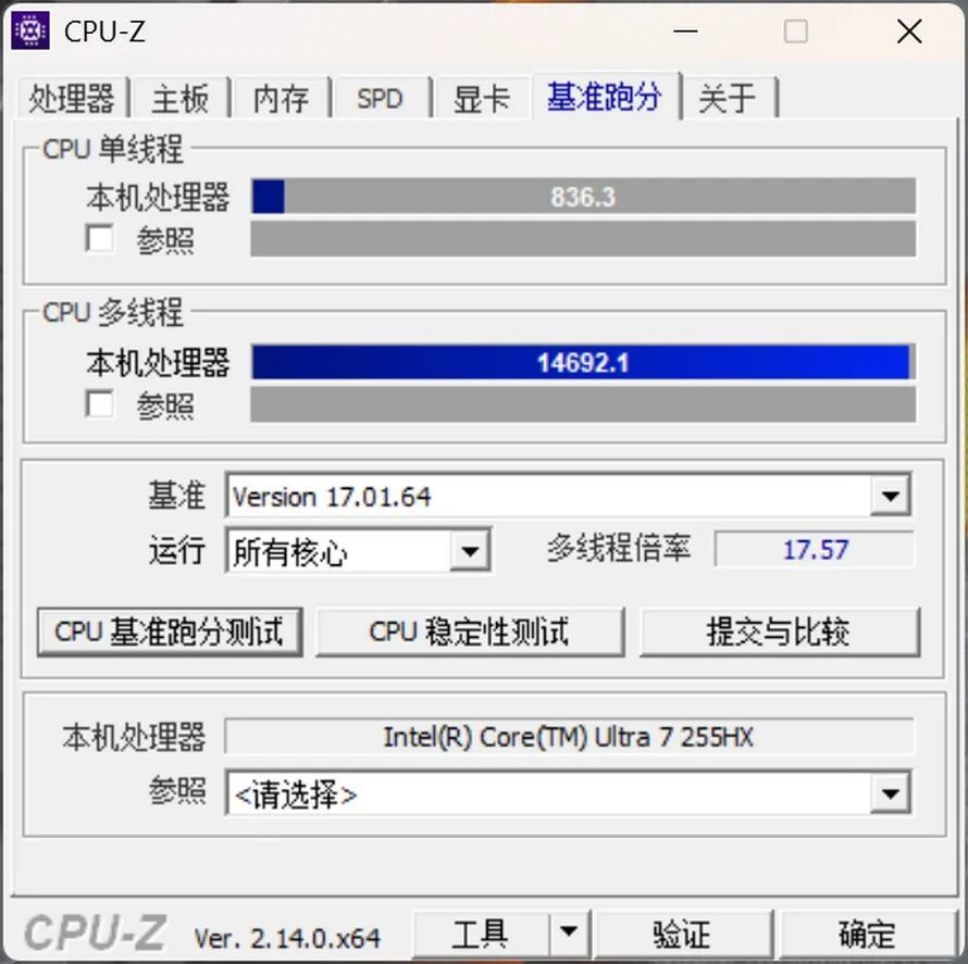 在CPU-Z基准测试(17.01.64)中,这颗255HX的单核得分为836.3,多核得分为14692.1。