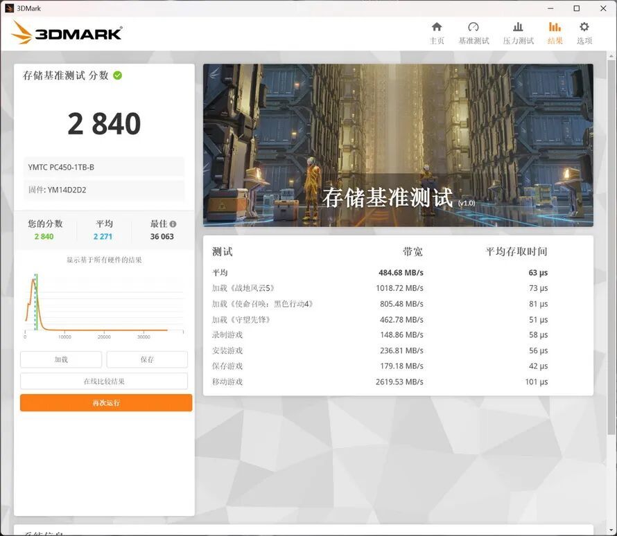 在3DMARK存储基准测试中,PC450 1TB得分为2840,平均带宽为484.68MB/s,平均存取时间为63μs。