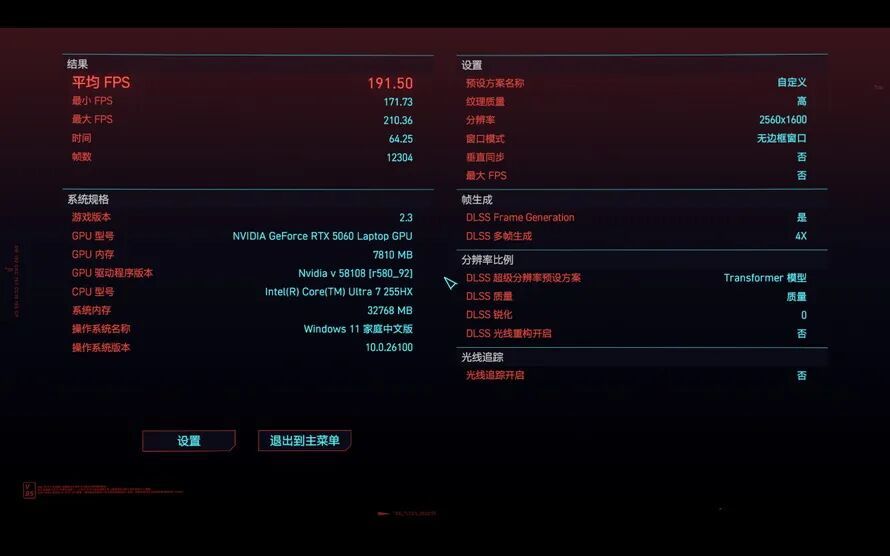 在《赛博朋克2077》中画质设定为全高,打开DLSS 4质量模式和4倍帧生成,运行游戏自带的基准测试工具,平均帧数达到了191.5,整体非常流畅丝滑。