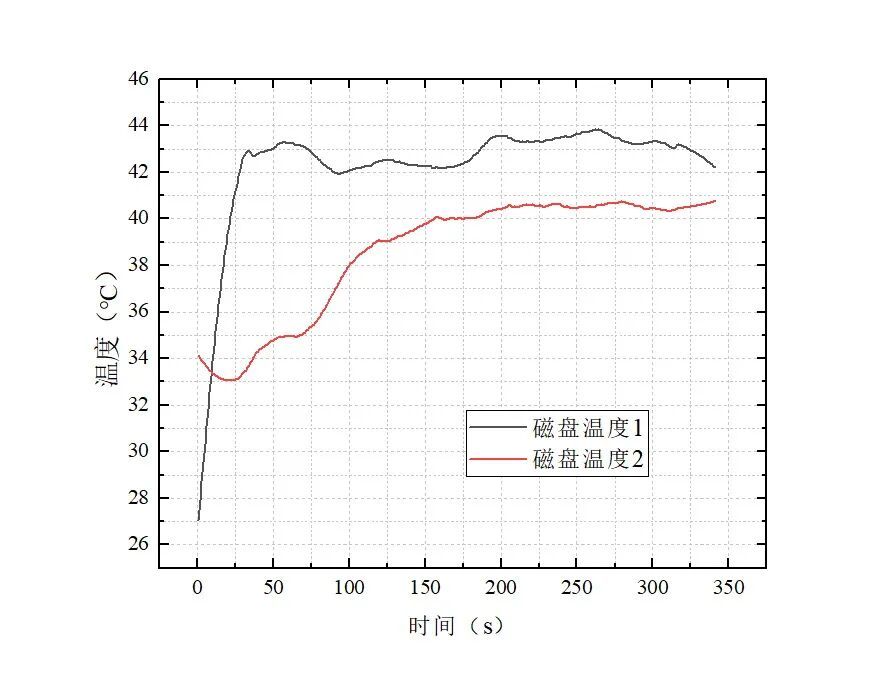 为此,我们使用fio 3.40工具往硬盘中写入约300GB的数据,同时记录其温度变化,来看看PC450 1TB在温度表现上如何。由于硬盘提供的可用温度变量为2个,因此我们将温度较高的变量(磁盘温度1)假设为主控温度,将温度略低的变量(磁盘温度2)假设为颗粒温度。