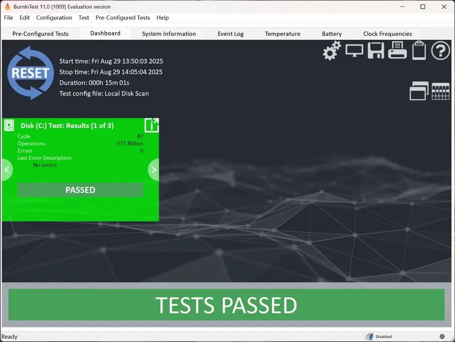 在BurnInTest硬盘写入压力测试的87次循环测试,PC450 1TB完美通过,全程没有发生一次错误。