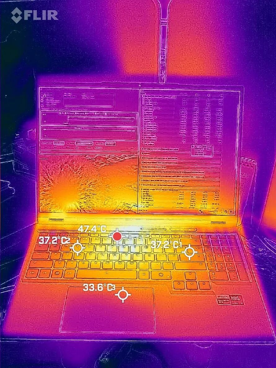 在静音狂暴模式下烤机30分钟,此时通过热成像仪器观察C面温度,发现高温热区基本集中在键盘中上方,约为47.4℃,主要键入区域为37.2℃,触控板及掌托区域温度稍低,为33.6℃。