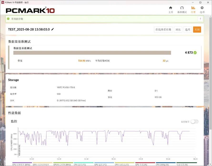 在数据盘基准测试中,PC450 1TB的得分为4873,带宽为724.96MB/s,平均存取时间为32μs。