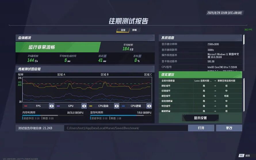 在《漫威争锋》中,画质设定为全高,打开DLSS 4质量模式以及4倍帧生成,运行游戏自带的基准测试工具,平均帧率为184。