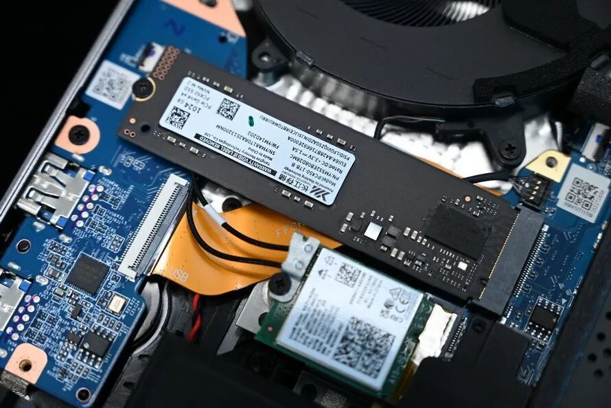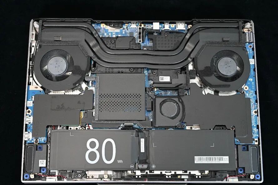 拆开D面的10枚螺丝,就可以撬开D壳。可以看到,耀世16 Ultra采用了时下流行的3风扇内吹设计,配备了一块80Wh的电池,具有两条M.2插槽,其中一条为PCIe 5.0 x4规格,已经预装了PC450 1TB硬盘,另一条则为空置状态,以备大家进行扩容。